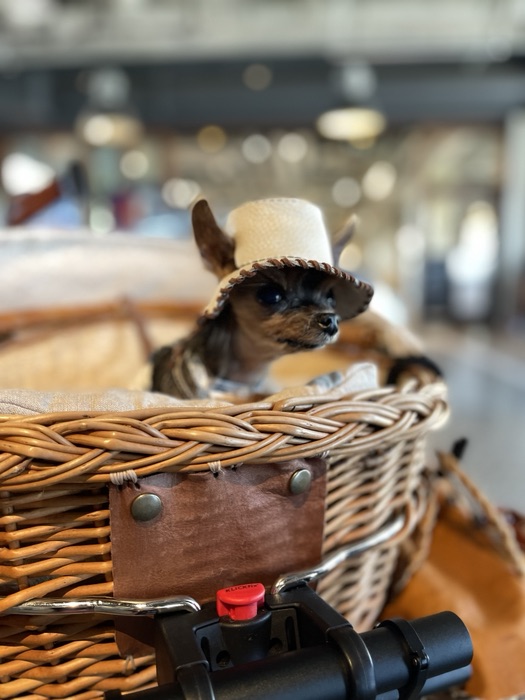 飼い主さんにとても愛されいるわんこさん、ハーネスも帽子もカートも(!)全て手作りとのこと。