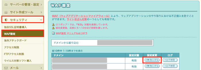 - サーバーにログインし、左のメニューから、セキュリティ設定 > WAF設定を選択
