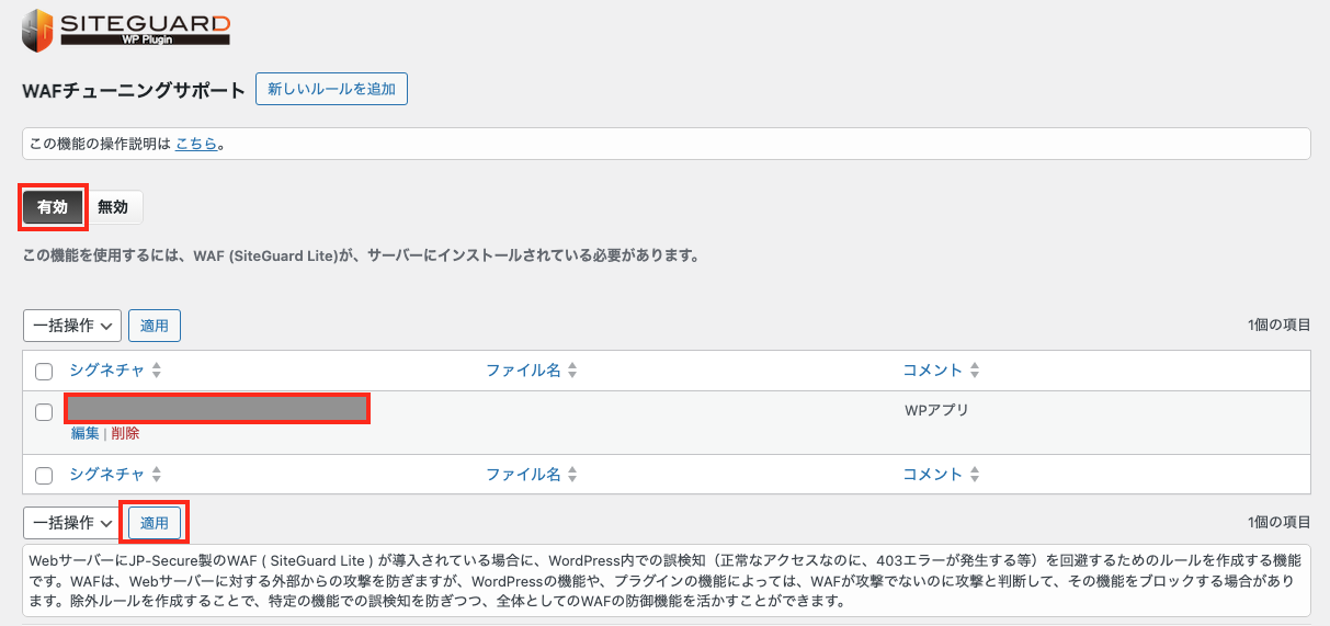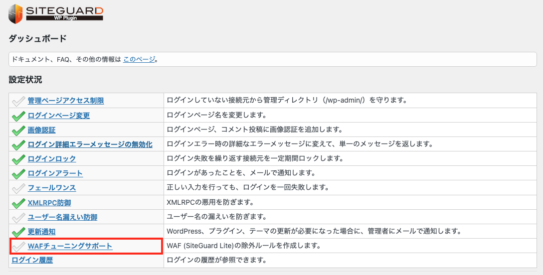 - 「WAFチューニングサポート」のトップに戻るので、機能を有効にします