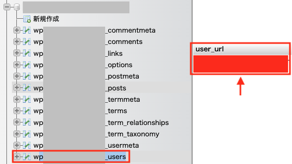 wp○○○_usersを選択すると、「user_url」に使用サイトのURLが表示されます