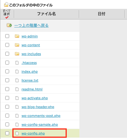 「wp-config.php」ファイルは、 WordPress のファイルディレクトリのルート直下に置かれています。