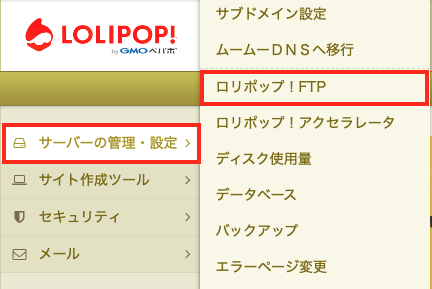 左のメニューサーバーの管理・設定>ロリポップFTPをクリック